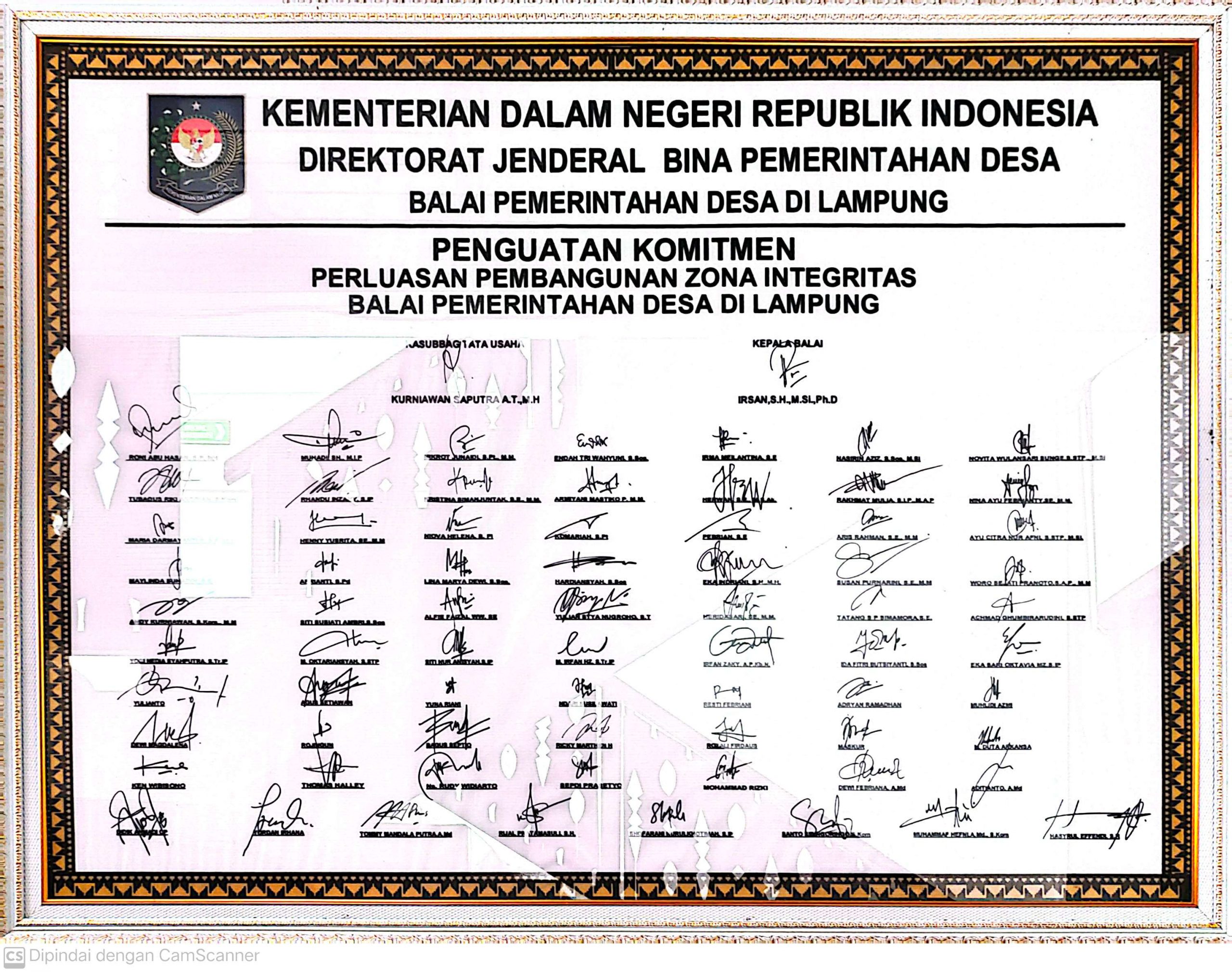 Diakhir sesi kegiatan dilakukan penandatanganan oleh seluruh pegawai di Balai Pemerintahan Desa di Lampung sebagai bentuk komitmen dalam mewujudkan Zona Integritas menuju Wilayah Bebas Korupsi (WBK) dan Wilayah Birokrasi Bersih dan Melayani (WBBM).