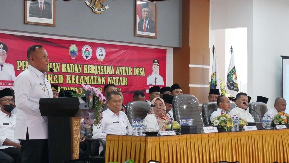 Natar, Lampung Selatan. Kepala Balai Pemerintahan Desa di Lampung yang dalam hal ini diwakili oleh Kepala Sub Bagian Tata Usaha Balai Pemerintahan Desa di Lampung Muhadi, S.H., M.I.P bersama dengan Bupati Lampung Selatan H. Nanang Ermanto, Camat Natar Supiah, S.Ag, Ketua APDESI Lampung Selatan Herry Putra dan Inspektur Inspektorat Kabupaten Lampung Selatan menghadiri Pengukuhan Badan Kerjasama Antar Desa Kecamatan Natar Masa Bakti 2022 s.d 2027 di Aula Balai Pemerintahan Desa di Lampung (Rabu, 30-11-2022)